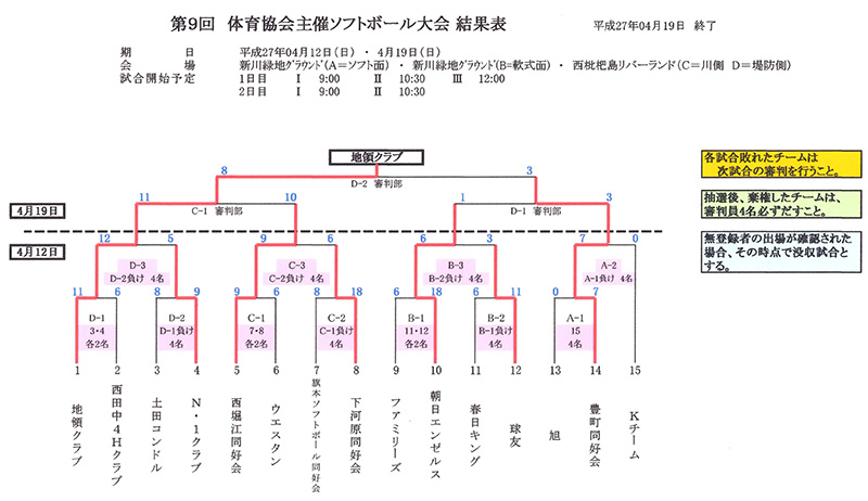 平成27年4月12日(日)~4月19日(日) 庄内川新川緑地(ソフト面・軟式面) 西枇杷島ソフトボール場(リバーランド)